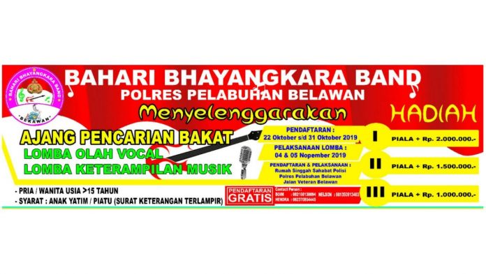 Semetarra Ketua Pelaksana Komp H.Justar Purba, SH, menjelaskan audisi pencarian bakat ini diberi nama “Bahari Bhayangkara Band” Polres Pelabuhan Belawan.