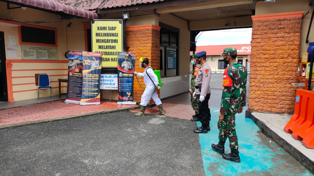 Penyemprotan cairan disinfektan langsung dipimpin Danki 4 Yon B Pelopor Tebing Tinggi Sat Brimob Polda Sumatera Utara, Iptu Ngatimin,S.H. dengan melibatkan 25 personel sebagian menggunakan APD lengkap dibantu personil Koramil 13/TT dan Satpol PP.
