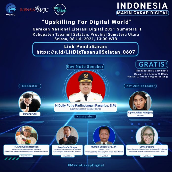 Dalam Literasi Digital yang digelar Selasa, (6/7/2021),  bertindak sebagai Sebagai Keynote Speaker, Bupati Kabupaten Tapanuli Selatan yaitu H. Dolly Putra Parlindungan Pasaribu, S.Pt, yang memberikan sambutan tujuan Literasi Digital agar masyarakat cakap dalam menggunakan teknologi digital, bermanfaat dalam membangun daerahnya masing masing oleh putra putri daerah melalui digital platform. Presiden RI, Joko Widodo juga memberikan sambutan dalam mendukung Literasi Digital Kominfo 2021.
