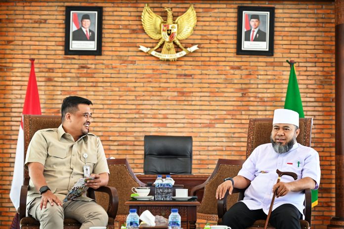MEDAN – Gubernur Sumatera Utara (Sumut) Muhammad Bobby Afif Nasution menerima kunjungan Gubernur Bengkulu Helmi Hasan di Anjungan Lantai 9, Kantor Gubernur, Jalan Diponegoro Nomor 30, Medan, Selasa (14/10/2025). Pada kesempatan tersebut, Bobby mengajak untuk berkolaborasi.
